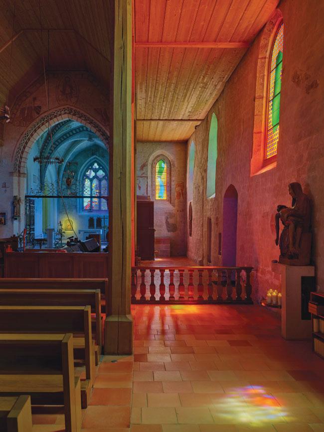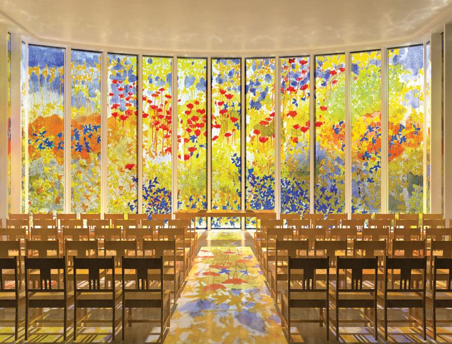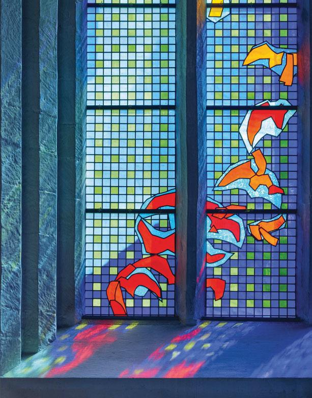 opposite: The sanctuary window eschews the traditional motifs of Christianity in favour of an abstraction that inculcates a sense of appreciation of nature in the viewer.