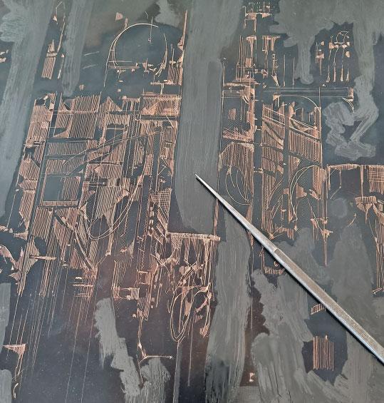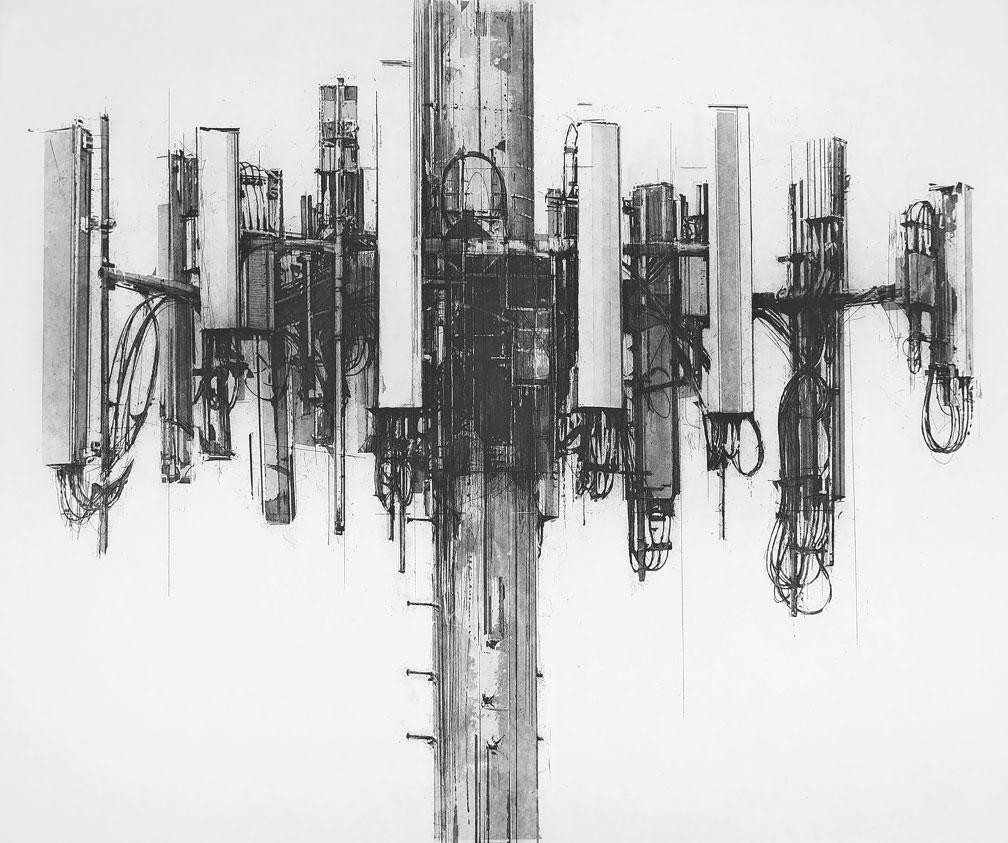 Chamberlain’s work is often etched on copper plates. Here the Gothic nature of communication masts is revealed in all their pre-printed glory – a landscape of scribings akin to the stonemasons’ tracings tables found in some cathedrals.