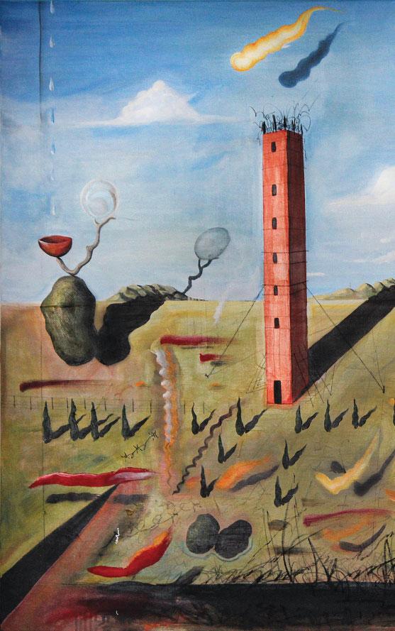 A more contemporary architect whose career followed a path of integrating the arts and also landscape into his architecture was Italian Carlo Scarpa. He was inspired by the craftsmanship and history of the Venetians, their glassmaking, their stonemasonry and their boat- and shipbuilding. He was also interested in Japan and the Japanese attention to detail and contemplation in both their buildings and their gardens. Such preoccupations conditioned highly original and subsequently much-admired buildings. A particular much-revered scheme, commissioned in 1968 and finished in 1978, is his Brion Sanctuary in San Vito d’Altivole near Treviso in Italy. Its centrepoint are the sarcophagi of Giuseppe Brion and his wife Onorina Tomasin. It is a masterful essay in its concrete materiality, the use of craft in its detail, water, and pensive, thoughtful vistas exhibiting a fusion of all of Scarpa’s Venetian and oriental references but reworked into an original architectonic synthesis. Whilst monolithic concrete is used to great sensitive effect by Scarpa, it was also the material of choice for the architectures of warfare. Ian Chamberlain, again, seizes on the daunting appearance of these architectures and represents them beautifully in their rough majesty.