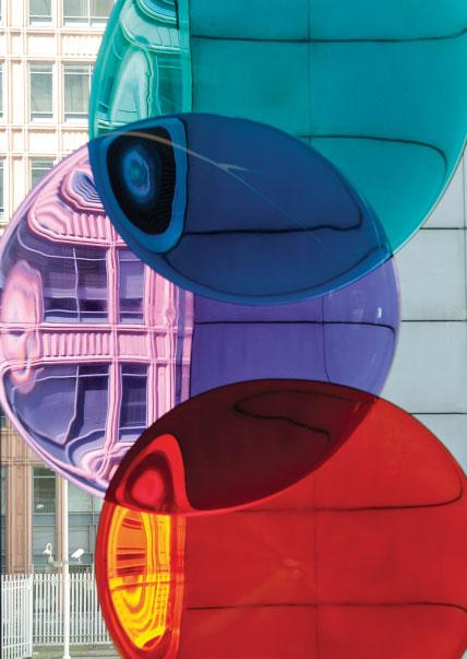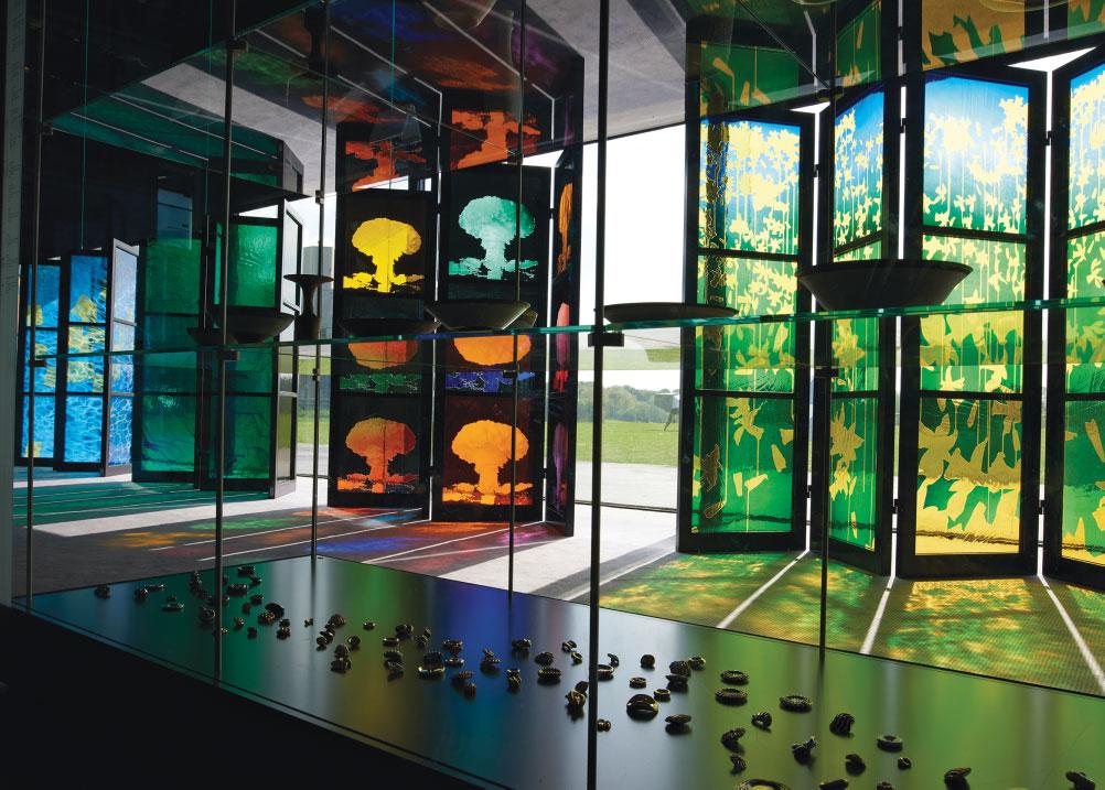opposite: Sculpting with the effect of the eye receiving photons through coloured glass, Clarke utilises the glazed end of the Sainsbury Centre to create spectacular views from outside the building, but the views are even more effective from the inside out.
