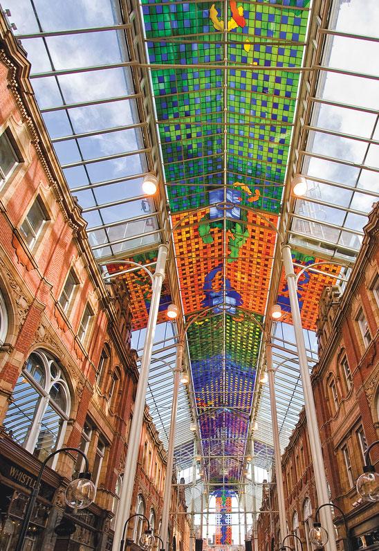 above: In its time this roof canopy was the largest secular stained-glass art installation in the world – 120 metres (400 feet) long and spanning from one end of the arcade to the other. It is sandwiched between theatre architect Frank Matcham’s Victorian façades.