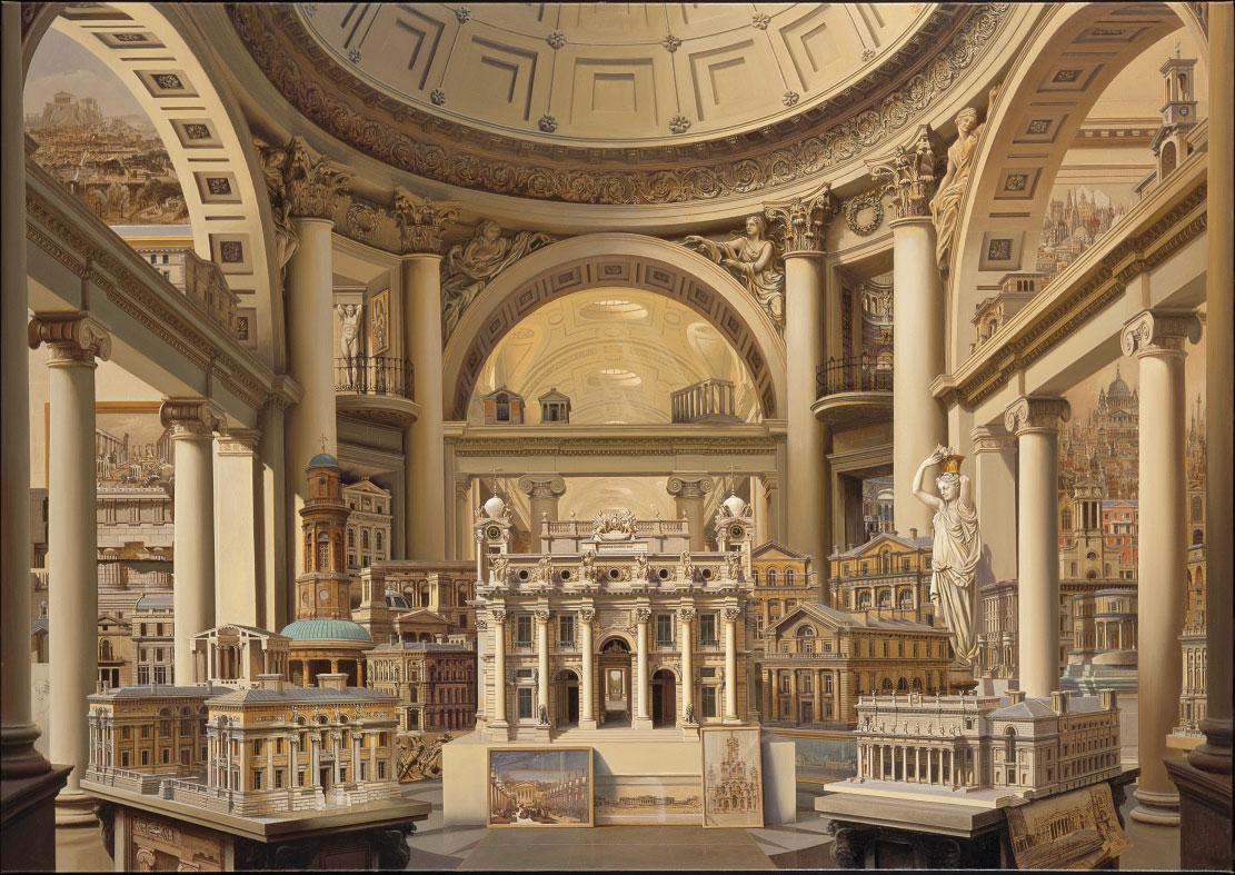 opposite: Capriccios are artistic conceits that bring views and scales of various objects together in a fantasy. In this case the life’s work of British architect CR Cockerell (1788–1863) is imagined in rooms of his own design. They are useful in showing the constant renewal and reinvention of their creator’s architectural lexicon.
