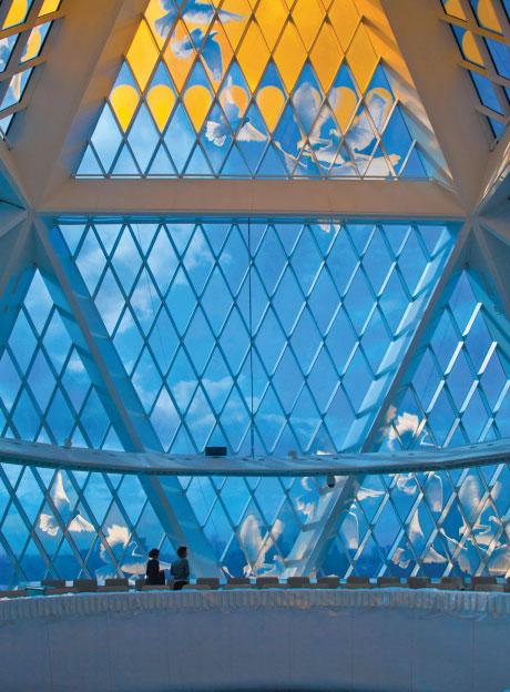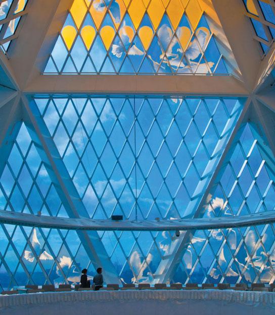 right: Brian Clarke and Norman Foster worked together to create a crystalline, pyramidic structure that surmounts Foster + Partners’ Palace of Peace and Reconciliation. Clark’s artwork at the apex of the pyramid acts as a beacon in the landscape.