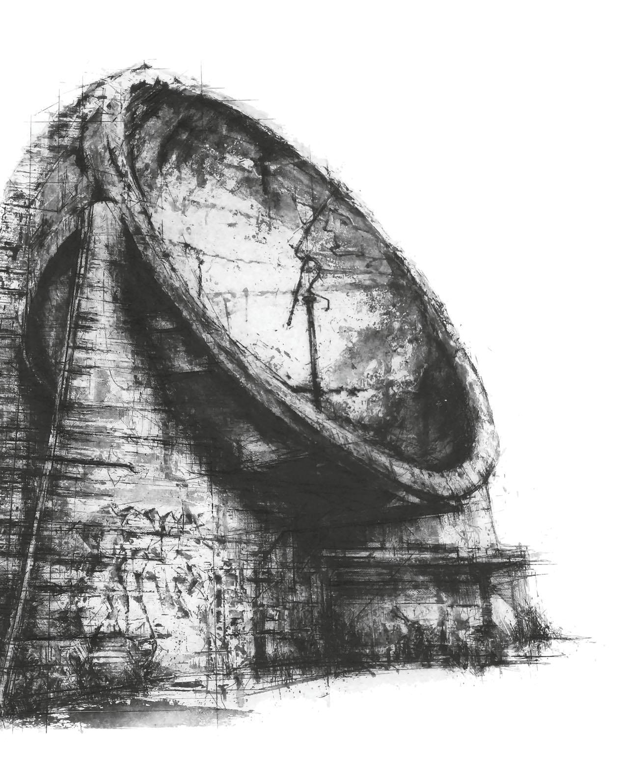One is guided through their vast, highly articulated volumes, which also deny access for some to certain parts, dependent on who one is. The invention of the pointed arch served a joint benefit in that it is both structural and ecclesiastical (it represents the Holy Trinity, and is formed by three interlocking circles). The innovation of the Gothic arch was then extrapolated, put to use to configure high vaulted, pointed ceilings and structurally enabled by flying buttresses (all derived from the pointed arch’s architectural genetics), and richly carved in stone inside and out – a perfect synthesis. Artist Ian Chamberlain treats the finials and spires of communication masts in a reverential way, portraying them with a sense of wonder similar to the Gothic church; they are conduits for communication with higher numinous powers and virtual entities.