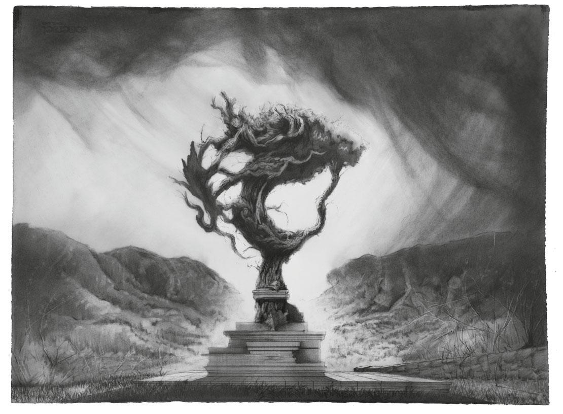 We might also think of the Baroque architectures and sculptures of Gian Lorenzo Bernini who created many of the sublime urban design set-pieces of Rome (such as the colonnade at the front of St Peter’s Basilica, 1656–67), many of its most revered architectures and interiors and many of its most beautiful and extraordinary crafted, sculptural objects. He was the most talented, foremost multivalent designer of his generation. His marvellous artifice and skills combined with an ingenious aptitude to portray mythic, religious, metamorphic movement and ecstasy, plus an incredible ability to sculpt marble to look like flesh, all earned him long years of papal patronage. This was not all of the artistic pursuits at which he excelled; he also painted, designed furniture, fountains, funerary monuments, stage scenery and theatrical machinery and wrote/ directed/acted in plays. His mastery and integration of nearly all the arts in his work was simply extraordinary – another perfect synthesis. Similarly to Bernini, famed for his Apollo and Daphne (1622–5) depicting Daphne metamorphosing into a tree, but in a contemporary manner, artist and architectural designer Nicholas Bava has created a series of charcoal drawings that explore the metamorphic technologised landscape of today and its hybrid ontology, both natural and unnatural –strangely unnerving and glowering.