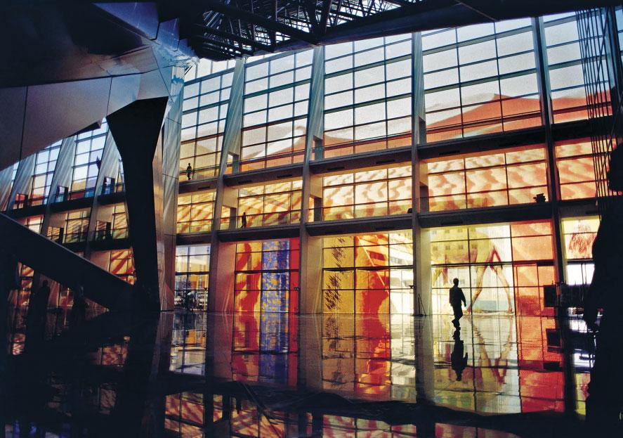 composition was the largest work in stained glass in Europe. Commissioned in 1996 and completed in 1997, his hundreds of ceiling panels for the Pfizer World Headquarters in New York accumulated into a giant environment. The core theme of the whole was the microbiology of viruses. Most spectacularly perhaps, in 2000 in Riyadh, in a collaboration with Norman Foster, he created the façade of the Al Faisaliah Center on an extraordinary scale. This was the largest work in stained glass in the world at the time. In 2006 in Kazakhstan, he worked again with Norman Foster on the Palace of Peace and Reconciliation, known also as the Pyramid of Peace and Accord. This is perhaps one of his most overtly spiritual works: the tower exudes a sense of humanist spirituality.