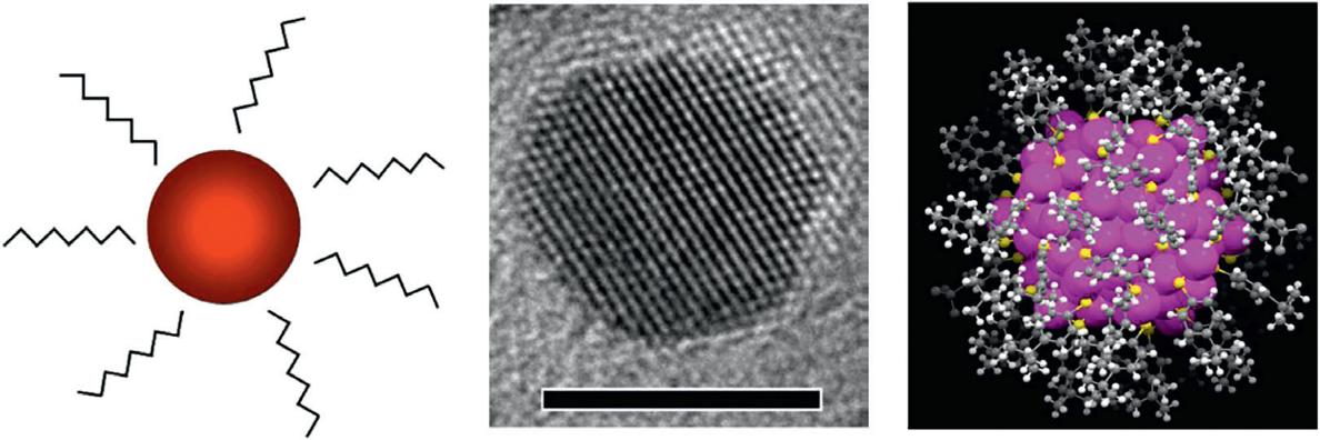 Second, the surface of NPs often remains poorly controlled in the synthesis and thus poorly understood. Questions on the precise composition of the surface adsorbates (i.e. stabilizers) and how the stabilizers are adsorbed on the particle surface are generally not known for most nanoparticle samples. While transmission electron microscopy (TEM) and various spectroscopy techniques are powerful in characterizing NPs, they often cannot reveal the true composition and bonding structure of the surface. For solution phase NPs, the surface includes the organic stabilizers and the interface to the inorganic core. This organic–inorganic interface (Figure 1.3a) is unfortunately very tough to study, [12, 13] because TEM is ineffective in imaging the particle surface (Figure 1.3b)