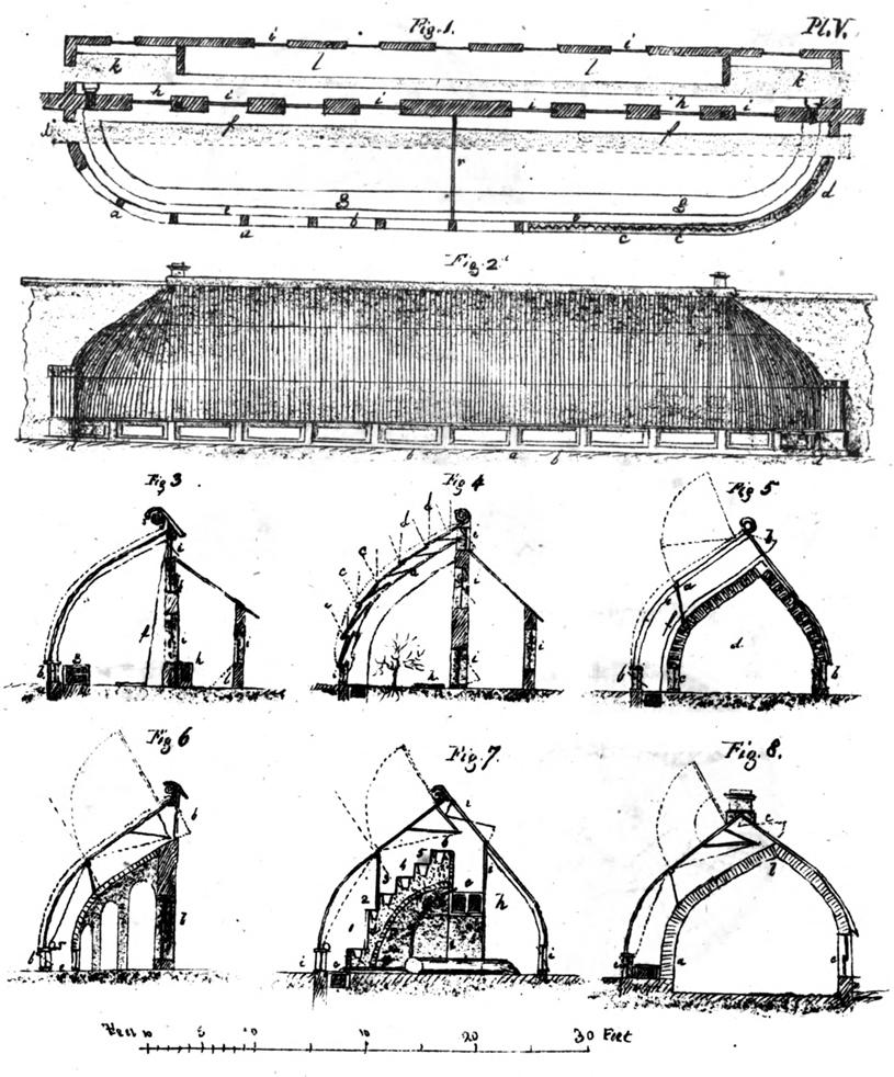 Figure 1.7. Study for a botanical greenhouse, John Claudius Loudon. Today, these studies seem strikingly modern and conformant to passive solar requirements (from: Loudon (1818))