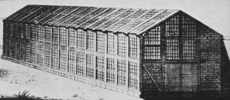 Figure 1.6. Glazed roof in an early greenhouse drawing, 1714. Copper engraving by Schwoebber (from: Pfann (1715))