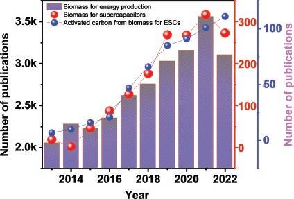 Figure 1.2 The number of publications having keywords of “biomass for energy production”, “biomass for supercapacitors”, and “activated carbon from biomass for supercapacitors” from 2013 to October 17, 2022. Source: Scopus