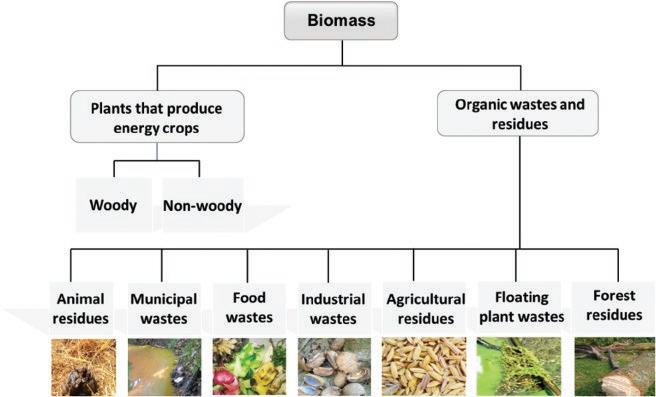 A wide range of materials, including agricultural and forest residues, food wastes, animal wastes, wastes of the wood processing industry, wastes of the zoo-technical industry, biodegradable industrial/household solid wastes, and algal and other aquatic organisms with varying compositions of lignocellulosic compounds are termed as biomass [46–48]. Accordingly, biomass can be mainly classified as plant and organic wastes/residues (Figure 1.3).