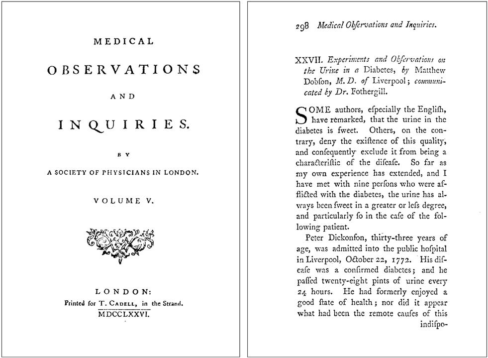 Figure 1.3 Frontispiece and opening page of the paper by Matthew Dobson (1776) in which he described the sweet taste of both urine and serum from a person with diabetes [2].