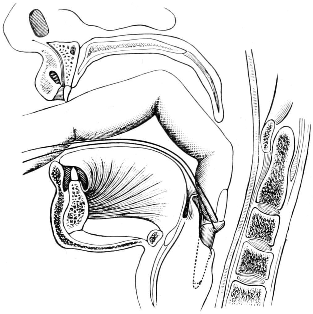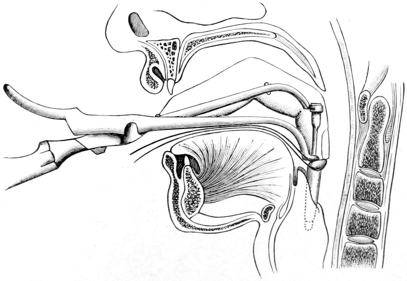 Standing in front of the patient the operator identifies the tip of the epiglottis with the forefinger of the left hand in the pharynx, this finger being used at the same time to raise and fix the epiglottis and also to serve as a guide to the tip of the tube, which is passed downward alongside it, by a maneuver similar to that by which the laryngoscopic mirror is used in the pharynx (Fig. 487). When the tip of the tube reaches the location behind the epiglottis the finger may be passed a little farther downward, plugging the entrance to the esophagus, while at the same time the handle of the instrument is so manipulated as to bring the tube forward. With gentle movement in the right direction it passes into the larynx (Fig. 488). It is then pressed downward until the flanged upper end has passed the epiglottis, after which the tube is disengaged, the handle and the obturator withdrawn, and the upper end of the tube pressed gently into place by the finger which still rests in the pharynx (Figs. 488,