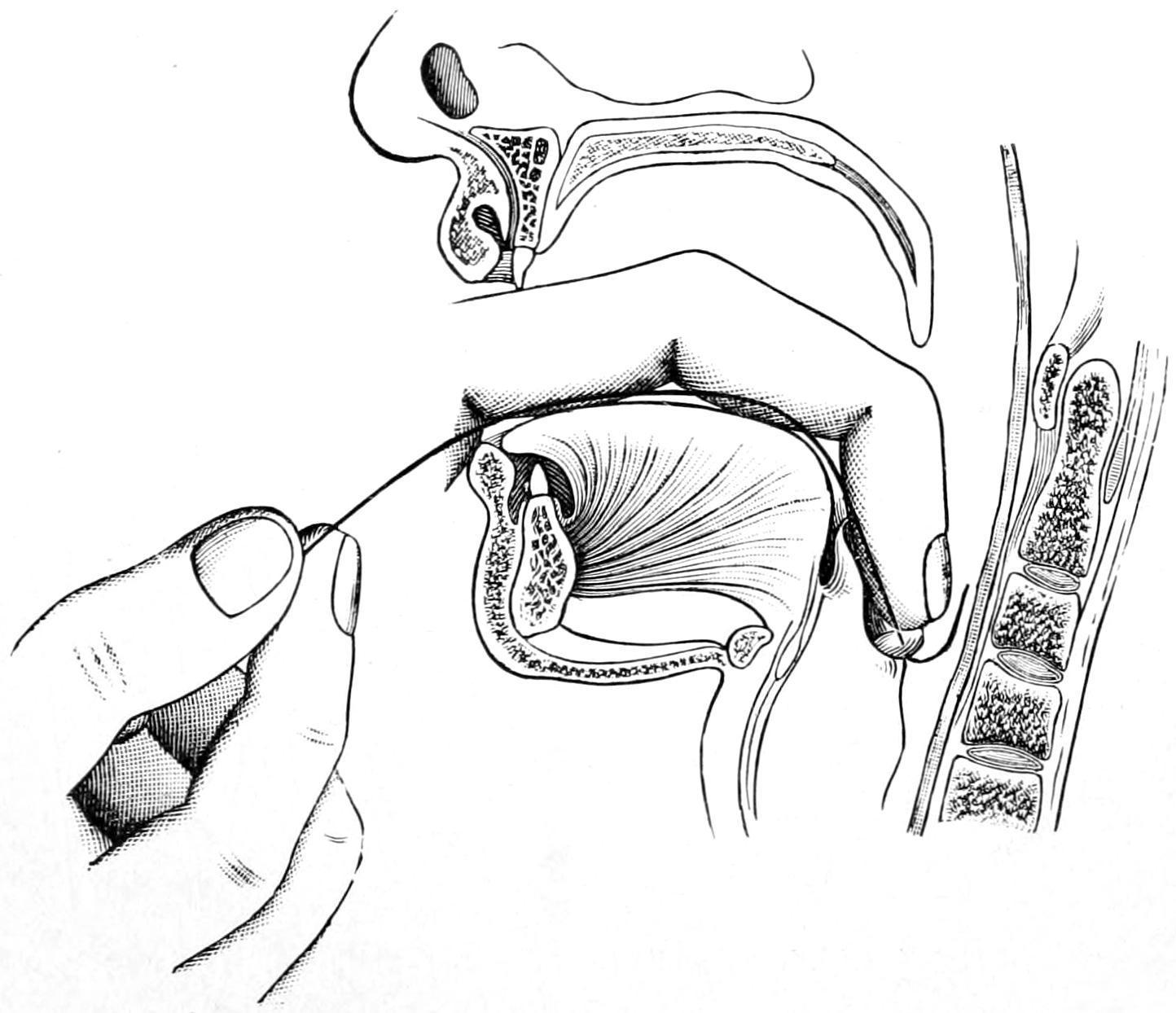 When the tube is in place there will come ease of respiration, at the same time violent coughing efforts, because of the irritation thus suddenly produced. So soon as it is apparent, both to the finger in the pharynx and from the relief of obstructive symptoms, that the tube is in its proper place, the finger may be once more passed into the pharynx, the tube pressed down, while the silk thread is withdrawn, since it is not intended to leave it for more than the time necessary to be assured that the tube will not have at once to come out again (Fig. 491). Before removing the thread the gag should be removed for a few moments, so that the effect of the excitement may