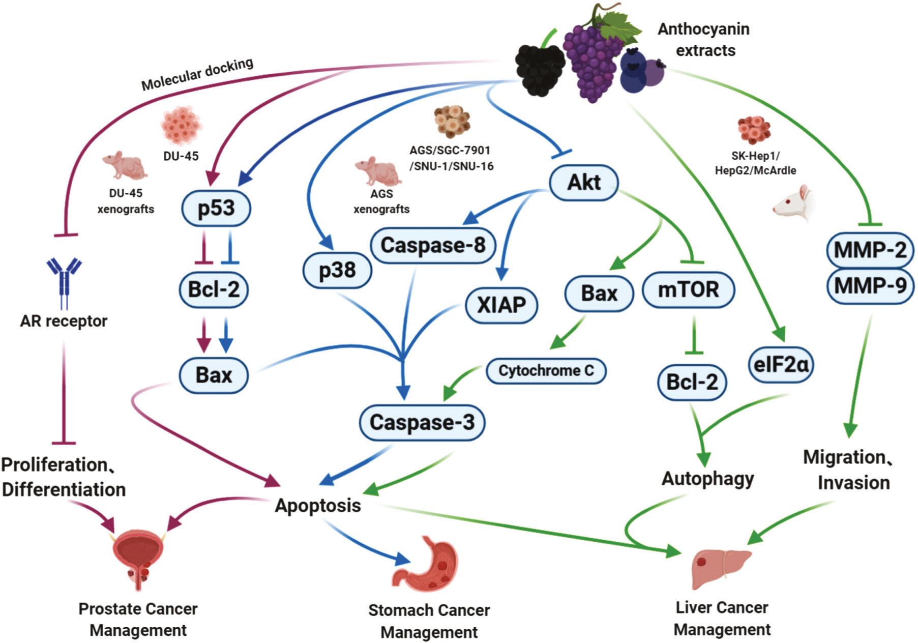 In another clinical trial, daily intake of anthocyanin-enriched fruits attenuated cancer metabolism and reduced breast cancer recurrence (Butalla et al., 2012). On account of other cancers, stomach, prostate, and liver cancer cells can be suppressed by anthocyanins through adjusting the apoptosis-related mediators (e.g., p53, Bcl-2, Bax, cytochrome C, Akt, and Caspase-3). Furthermore, anthocyanins reduced invasion of prostate cancer and liver cancer by targeting AR receptor, and regulating the expression levels of mTOR, Bcl-2, eIF2α, MMP-2, and MMP-9 (Figure 1.5). Black raspberries (Rubus occidentalis L.) exerted beneficial effects on the prevention of prostate cancer in men enrolled in a clinical trial (Gu et al., 2014). Taken together, anthocyanins could thus be promising medicines to help inhibit the proliferation and spread of cancer cells.