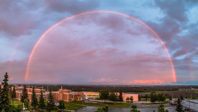Fig. 2.2 Sunset rainbow in Fairbanks, Alaska shortly before sunset 21 June 2020. The absence of the blue end of the spectrum in the sun’s light at sunset is the reason why only the red band of the bow is visible and why the sky enclosed by the primary bow has a rosy hue. Photo By Luke Culver, used with permission