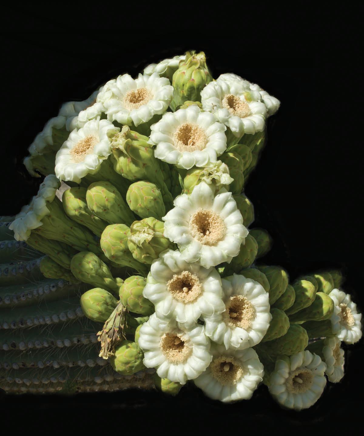 Desert plants are o en in environments clu ered with weeds, rocks, roots, and distracting objects. To isolate the plant and owers, I o en surround it with black construction paper. My backpack includes a pair of thick leather gloves, packets of black paper, tweezers and tongs, scissors, and Band-Aids (useful for inadvertent encounters with spines, etc.). Most of my photographs were taken with a macro lens, though for tall cacti I used a telephoto lens. Minimal processing of the digital les, either generated by scanning transparency lms or using digital data from the camera, was done with Photoshop, with care being taken to maintain the color values of the original subject.