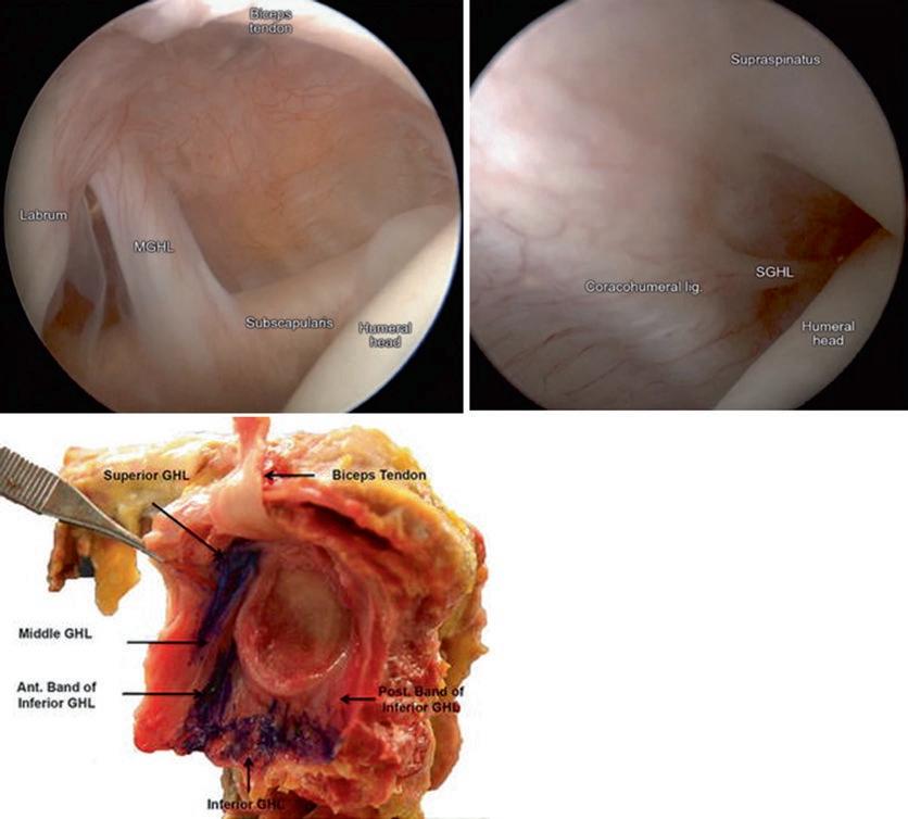 Glenohumeral ligaments are disposed in a multi-directional fashion, providing stability to the joint. Coracohumeral and superior glenohumeral ligament (GHL) act as inferior stabilizers in adduction and external rotation. Middle GHL restrains external rotation and provides anterosuperior stability. Finally, the inferior GHL complex is the most important stabilizer against anteroinferior translation [4].