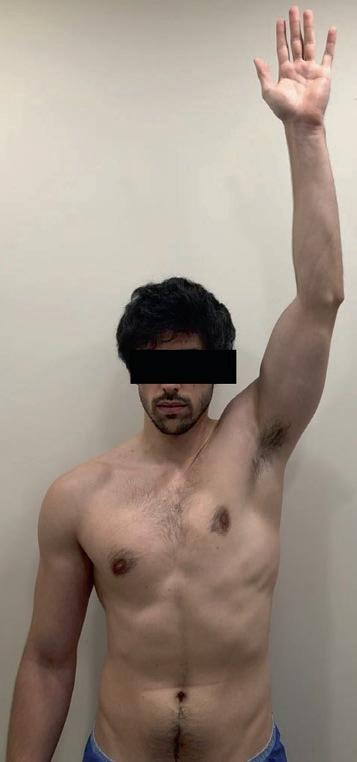 (Fig. 3.7a). The position of the arm changes the maximum ROM available, in neutral position and the elbow 90° fexed we could achieve around 75° of external rotation, whereas in 90° of arm abduction up to 98° of internal rotation (Fig. 3.7b) [13]. Producing this action, we have infraspinatus, teres minor, and long head of triceps brachialis. Performing this action, we fnd the least powerful movement of the shoulder [2]. Disorders of the rotator cuff are the main reason for active external rotation defcit.