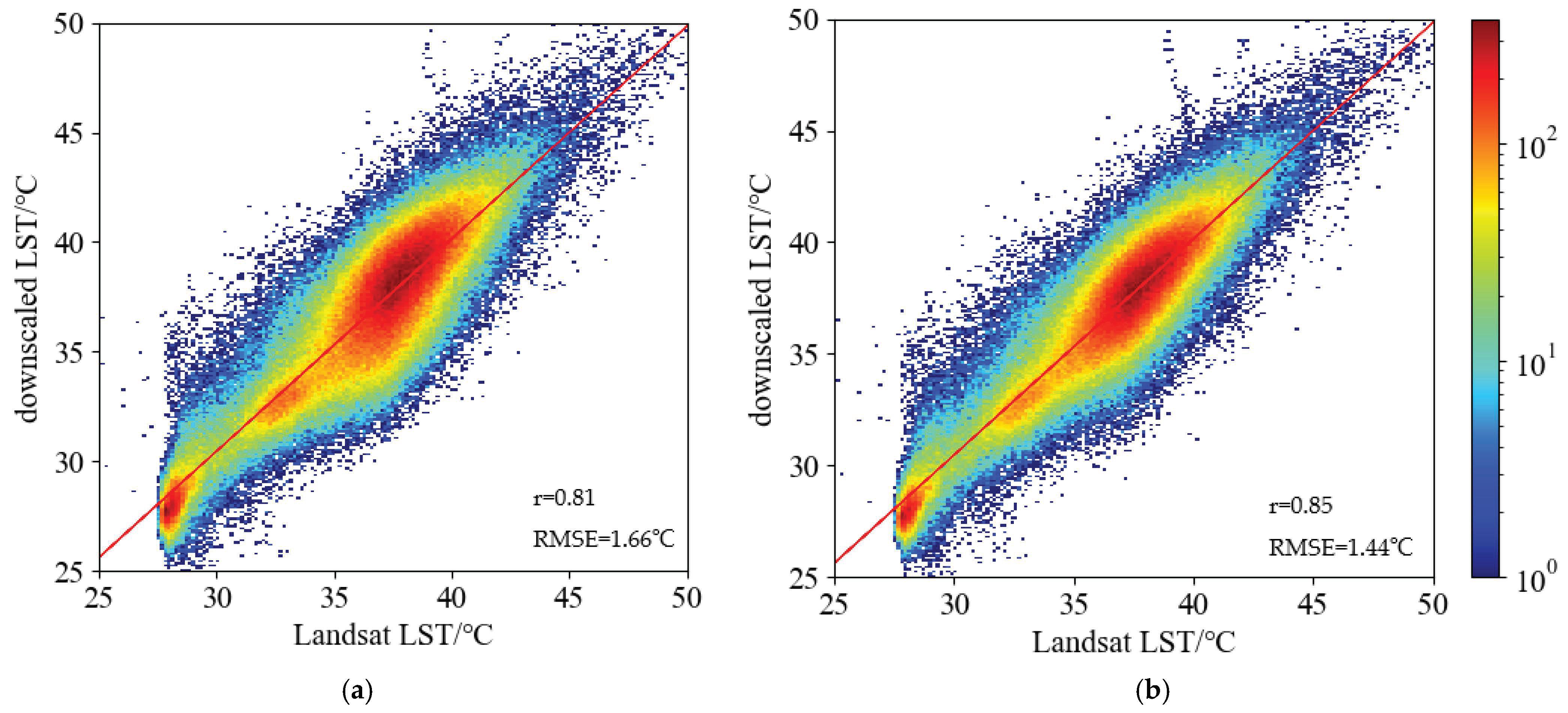 Withrespecttothescaleeffectofthelandsurfacetemperaturedownscalingmodel, Puetal.[46,47]concludedthatthe“constantscalerelationship”betweenLSTanddriving factorsdoesnotholdundercertainconditions.ComparingFigure 2awithFigure 2bfor