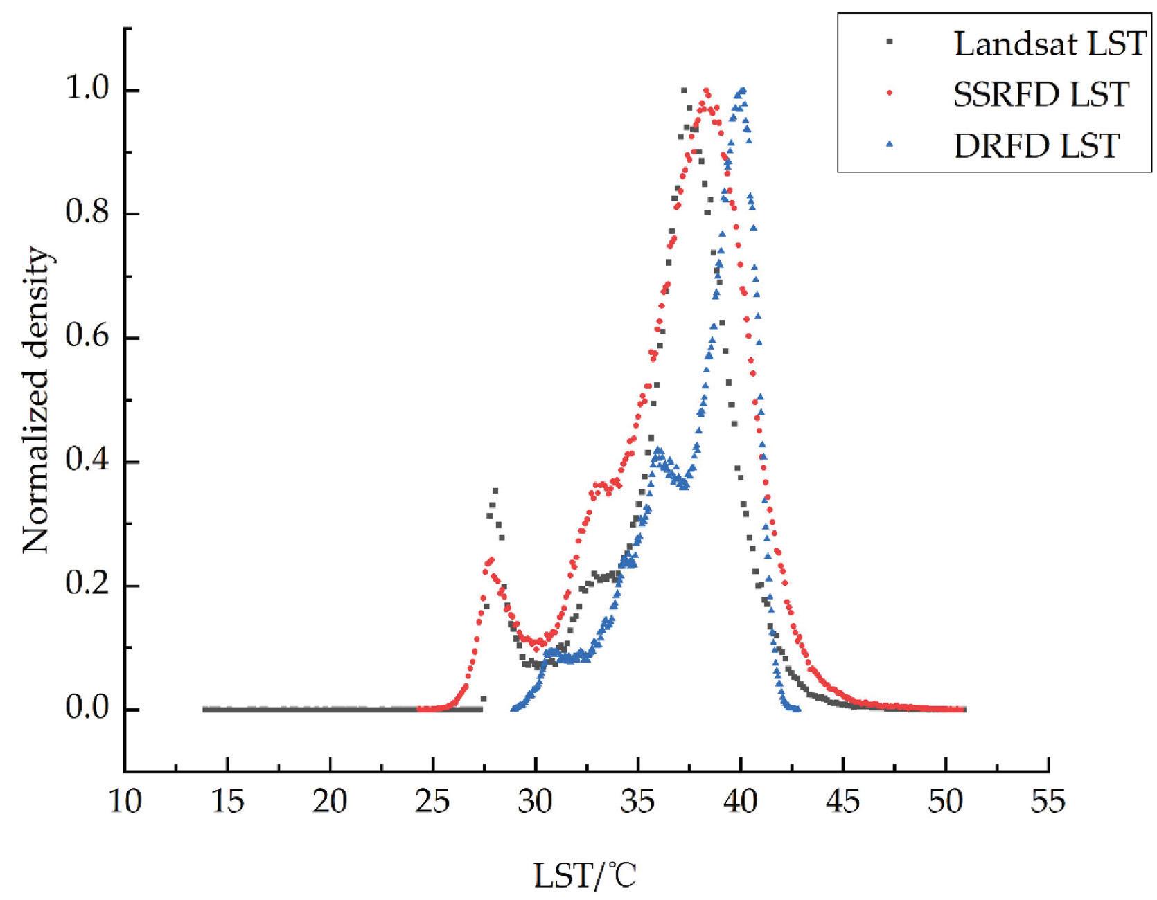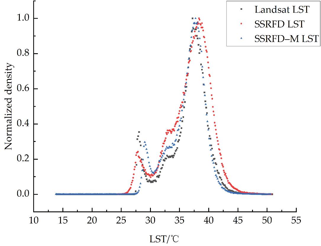 Figure 5a,bshowsthecorrelationplotsofLandsatLSTwiththeresultsfromSSRFD andSSRFD-M,respectively,ata30-mspatialresolution,whererimprovesfrom0.81to0.85 andRMSEdecreasesfrom1.66to1.44 ◦ Cafteraddingthespatialmorphologicalparameters. ThestatisticalhistogramsofLandsatLSTanddownscalingresultsaregiveninFigure 6. ComparedtotheSSRFDresult,SSRFD-MismorematchedwithLandsatLSTindistribution shape,especiallybetween35and40 ◦ Cwherebuildingsandconcretepavementsaremainly distributed.Otherwise,thefeatureswithtemperaturesbetween28and35 ◦ Caremainly vegetationandwaterbodies.Thecurvesofthetwodownscalingresultsinthisinterval arehigherthanLandsatLST,indicatingthattheremaybesomeLSToverestimationin downscalingresultsforvegetationandwaterbodyareas.Combinedwiththeanalysisof Figure 5,weconcludethattheSSRFD-MmodelperformsbetterthanSSRFD,especiallyfor densebuildingareas.