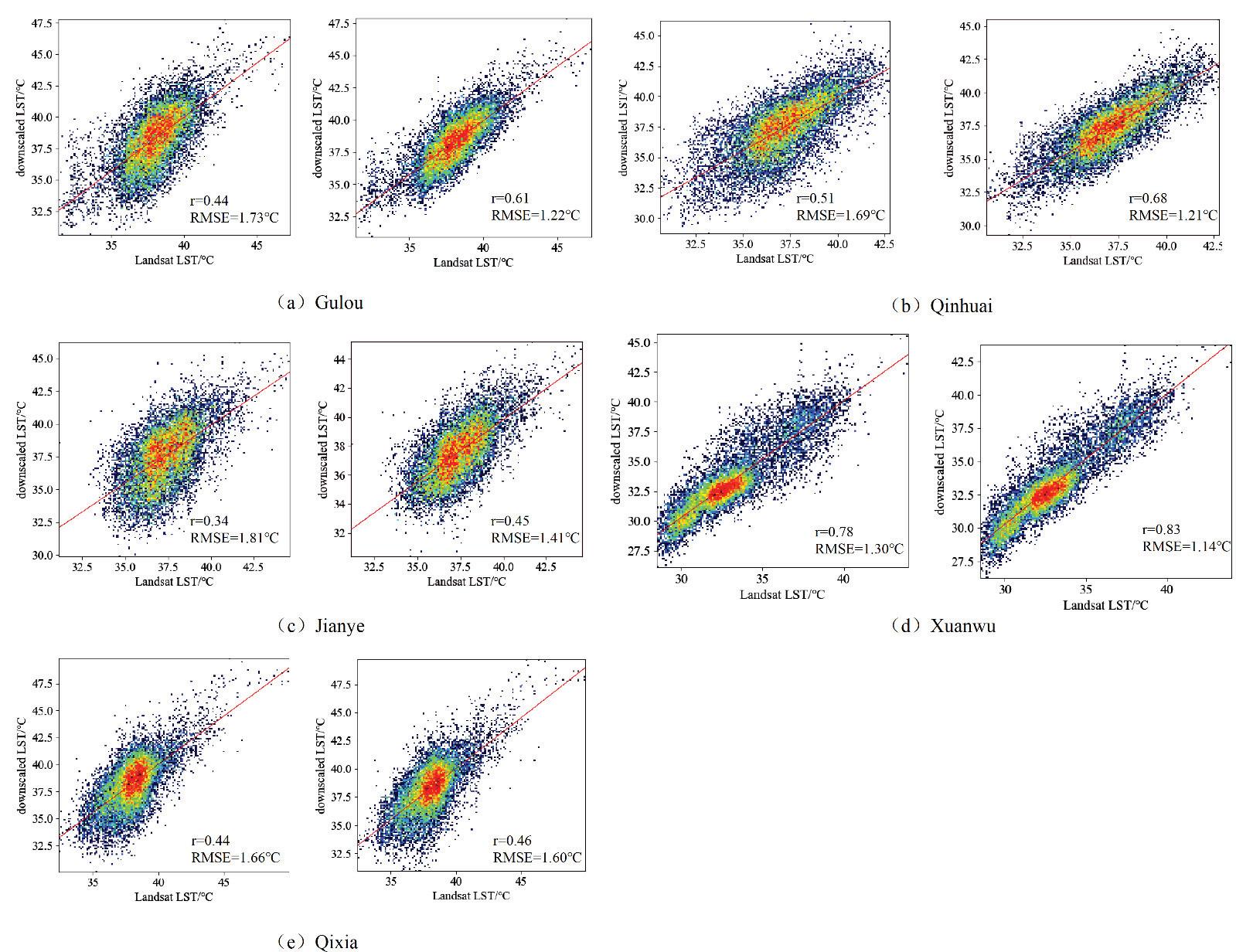 fore,theLSTdistributioniscloselyrelatedtothespatialmorphologicalcharacteristicsof buildings.ThesefiguresallexhibitthatthedownscalingresultsofSSRFDunderestimated theLSTforsomeregionsbetween35and40 ◦ C.AccordingtoFigure 7d,randRMSE valueschangedfrom0.78and1.30 ◦ Cto0.83and1.14 ◦ Cbeforeandafterconsidering spatialmorphologicalparametersinXuanwuDistrict,respectively,withaslightlysmaller improvementinaccuracyrelativetotheGulouandQinhuaiDistricts.Statistically,among theXuanwuDistrictcoveredbythestudyarea,non-built-upareassuchasZhongShan ScenicAreaandXuanwuLakeaccountforapproximately50%ofthedistrict.Therefore, theinclusionofspatialmorphologicalparametershaslessinfluenceonthedownscaling resultsoftheseareas.IfthedownscalingresultsofbuildingareasinXuanwuDistrictare countedseparately,theRMSEofSSRFD-Mdecreasesfrom1.96to1.17 ◦ Ccomparedto theSSRFDresults,whichprovesthatSSRFD-Mcaneffectivelyimprovethedownscaling effectindensebuildingareas.Figure 7eindicatesthattheSSRFD-MresultsforQixia onlyimproved/decreasedrandRMSEvaluesby0.02/0.06 ◦ C,respectively,comparedto SSRFD.ThereasonforthisismainlythedifferenceinyearsbetweenSentinel-3LSTdata andbuildingdata.ThetypeoflandsurfacecoverinsomeregionsofQixiahaschanged significantly.Forexample,theeasternsideofNingluoExpresswayandthenorthernsideof QixiaAvenuehavechangedfromnaturalsurfacestobuildingandroadtypes.Thebuilding datausedcannotaccuratelyexpressthespatialmorphologicalcharacteristicsoftheseareas andcannoteffectivelyimprovetheaccuracyofLSTdownscaling.Inaddition,wefound thataspatialresolutionof30mmaynotbesufficienttoshowthesurfacetemperature distributionpatterninsidecomplexbuildingareas.