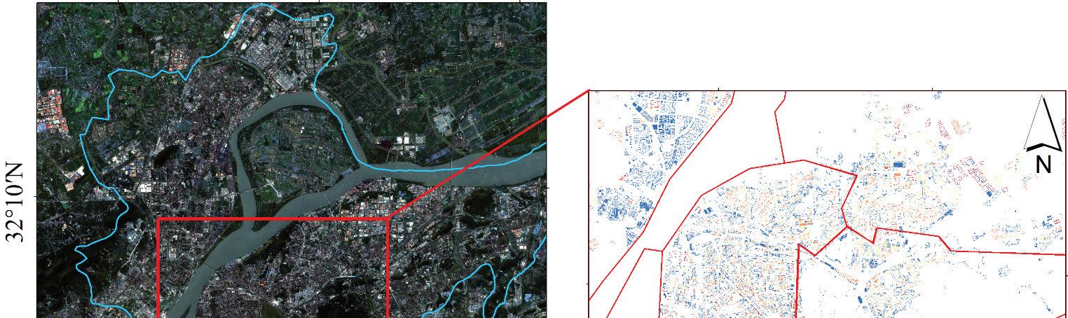 Figure1. Sentinel-2true-colorcompositeimageandbuildingdataofthestudyarea(blueline representsthemainurbanareaofNanjing;redlinesrepresentthestudyareaboundaries).