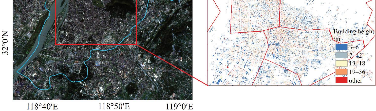 ThecentralurbanregionofNanjing,JiangsuProvince,Chinawaschosenasthestudy areabecauseitcontainsavarietyofunderlyingsurfacetypessuchasbuildings,vegetation andwaterbodies,whichhelpstocarryoutlandsurfacetemperaturedownscalingstudiesof complexgroundcovertypes.Figure 1 presentsatrue-colorimageandbuildingdistribution mapofthestudyareaataspatialresolutionof10m.
