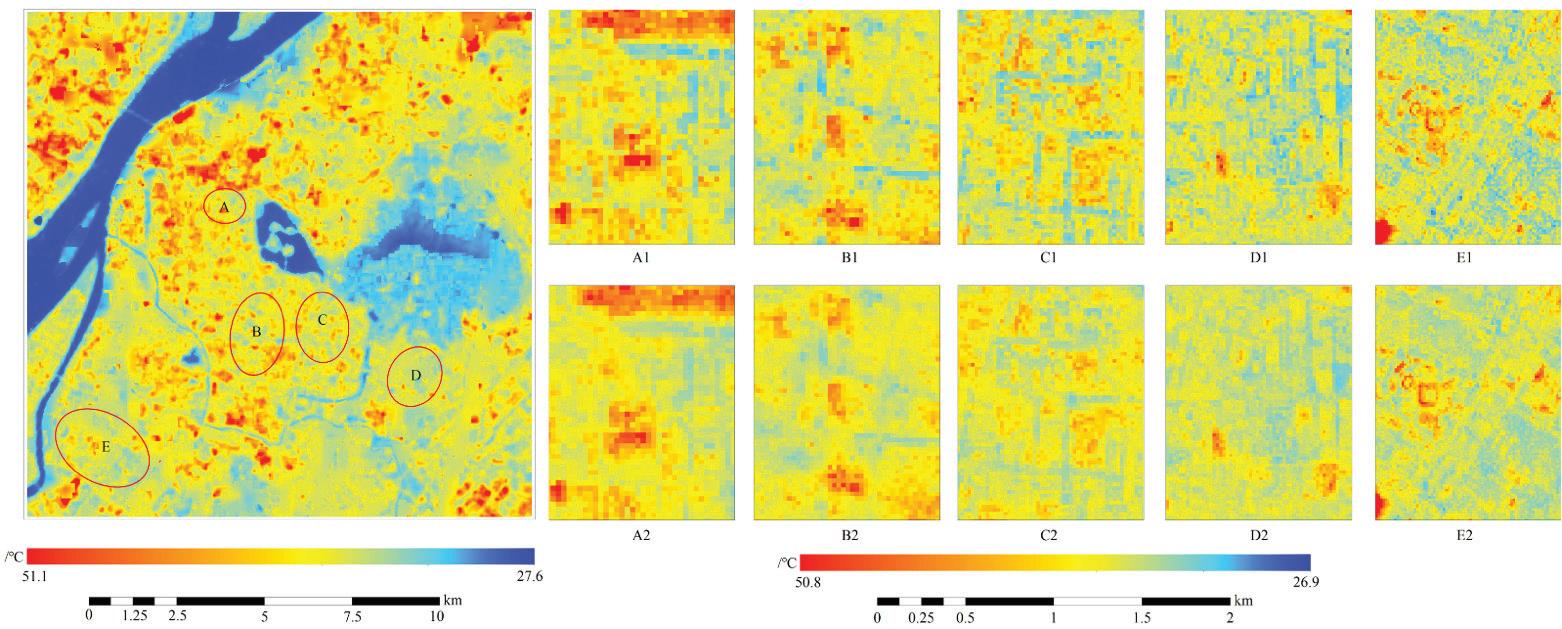 (1) The900-mLSTwasdownscaledstep-by-stepontheorderof450,150and30m. ComparedtotheresultsobtainedwithDRFD,thervaluebetweentheSSRFDresults andLandsatLSTwasimprovedby0.21,andtheRMSEvaluewasreducedby0.94 ◦ C. TheSSRFDresultsmoreaccuratelycapturedthespatialdistributioncharacteristicsof thesurfacetemperature,includingthehigh-temperaturezoneofbuildingsandthe low-temperaturezoneofwaterandvegetation.Theunderestimation/overestimation phenomenonofDRFDresultinginlargeerrorsinthehigh/lowtemperaturezonewas avoidedorattenuatedwhenusingtheSSRFDmethod.