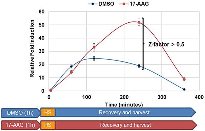 Differences in HSR transcription rates were observed between DMSO and 17-AAG pretreatments in HEK293 cells. For DMSO control cells, the HSR increased over time with a maximum at 2 h then decreased to baseline at 6 h. For 17-AAG pretreated cells, the HSR increased over time with a maximum of around 4 h and remained above baseline at 6 h, indicating that HSP90 N-terminal inhibition increased the degree and duration of the HSR. At 4 h the difference between DMSO and 17-AAG treated cells gave a Z-factor of 0.65 suggesting that 17-AAG warrants further attention as an amplifier of the HSR (Fig. 3). Only the results for DMSO and 17-AAG treatment are shown.