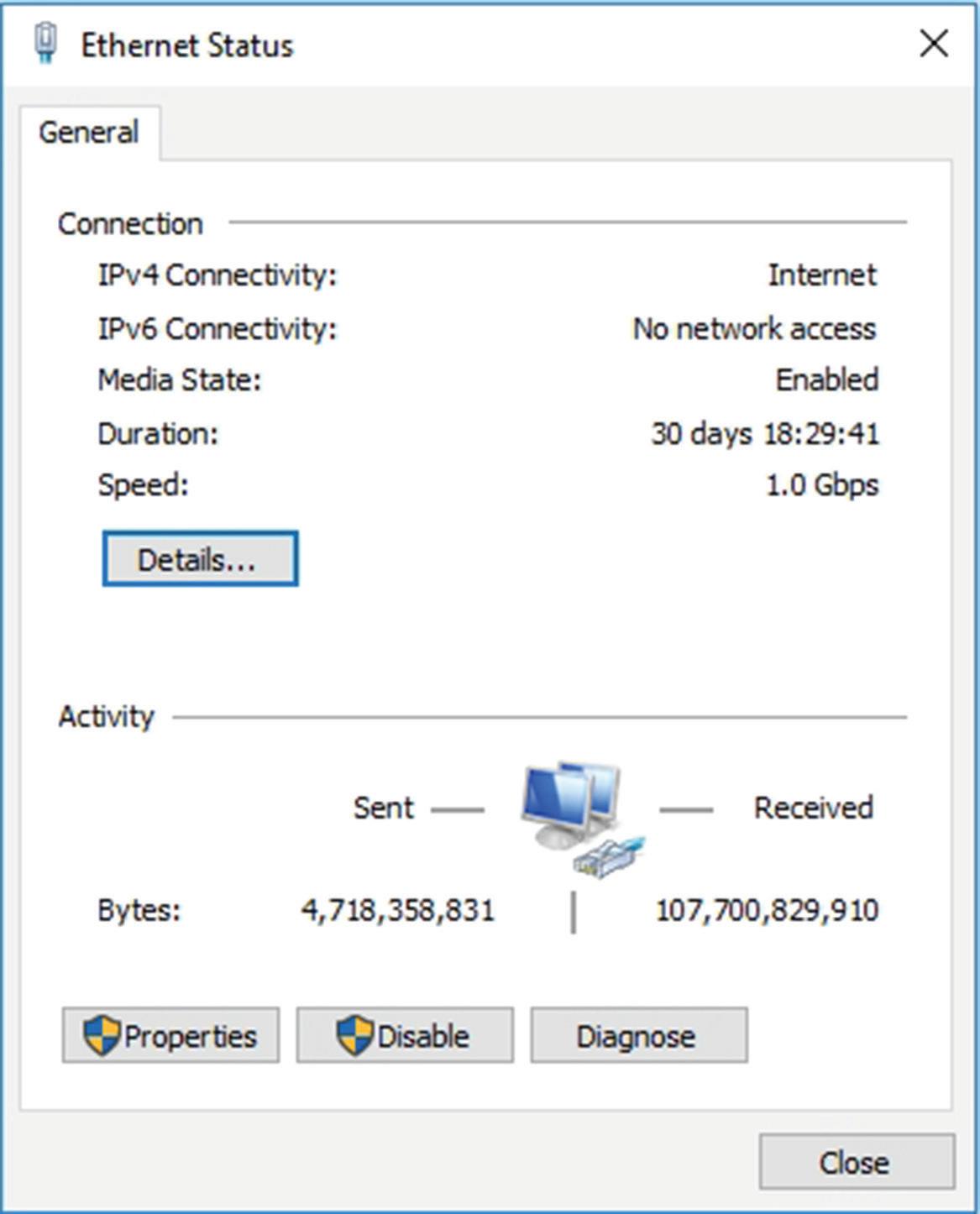e. Now, double-click the Ethernet icon. The Ethernet Status dialog box opens, as shown in Figure 1.10. This dialog box displays the type of connectivity, speed, and how long the adapter has been connected; it also shows the total bytes sent and received. In addition, from this dialog box, you can access the Properties dialog box and diagnose the network adapter, if necessary.