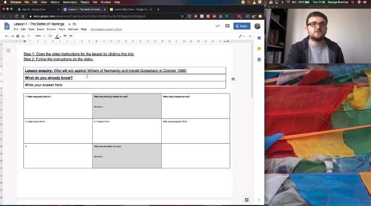Forthesekindsofengagementchallenges,historyteacher GeorgeBramleyfromBrigshawHighSchoolinLeeds,England,sharedanelegantsolution.Georgerequiresstudents tohavealesson-specificGoogleDocopenastheywatchhis prerecordedlecture.Throughoutthelesson,heasksstudents tojotdowntime-specificnotesandanswers.Becausehis questionsaresetuptobeembeddedwithinthecontentasitis explained(e.g.“Whathappenedbefore?”“WhatshouldKing