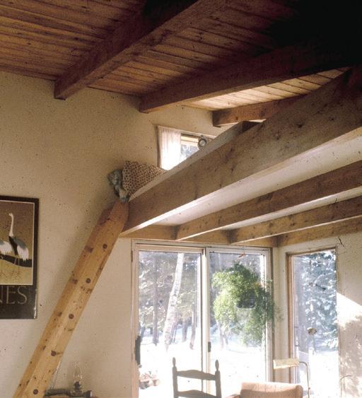 From the back door, southwest reading and thinking corner. Sleeping loft overhead. Corner of 36” × 80” writing desk at bottom right.