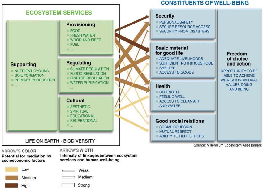 FIG.1.2. Left,ecosystemservicesaredividedintofourboxesrelatedtomajorserviceswithineach. Right,listofcomponentsofwell-being.Linedarknessindicatesthepotentialeffectsofsocioeconomic factorswhereaslinethicknessshowsintensityofeffectsofecosystemservicesonhumanwell-being. Source: FromMillenniumEcosystemAssessment(2005),presentation;CreditedtoMillenniumEcosystemAssessment(2005).