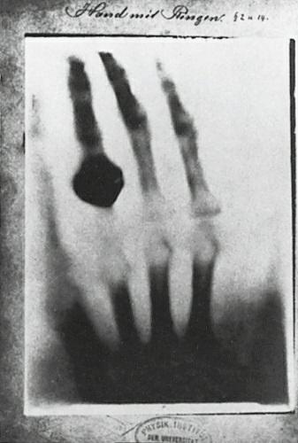 first radiograph, which demonstrates the bones of the hand of Roentgen’s wife Bertha with a ring on one finger.