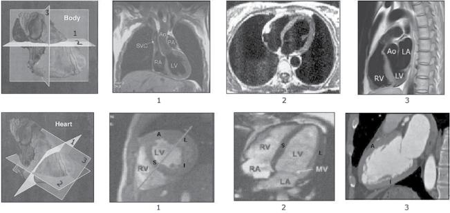Figure 1.4 CMR imaging. (a) Transections of the heart following the classical human body planes: (1) frontal plane, (2) horizontal plane, and (3) sagittal plane. (b) Transections of the heart following the heart planes that cut the body obliquely. These are the planes used by the cardiac imaging experts: (1) short‐axis (transverse) view, in this case at mid‐level (see b (1)); (2) horizontal long‐axis view; (3) vertical long‐axis view (oblique sagittal‐like). Check the great difference between the sagittal plane according to human body planes (a (3)) and the heart planes (b (3)). (b) shows the four walls of the heart with the classical names: septal (S), anterior (A), lateral (L) and inferoposterior. Currently, the inferoposterior wall is for consistency named inferior (I) (see Figure 1.8).