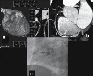 Computed coronary tomography angiography (CTA) is an alternative to invasive angiography to explore the coronary artery anatomy, especially in situations with low likelihood of need for percutaneous coronary