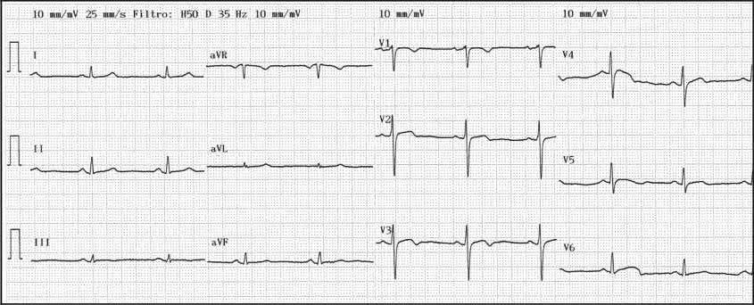 ECG (Figure). The ECG findings were considered a normal variant in a woman and the treadmill test was negative. The ECG shows sinus rhythm with mild biphasic T waves in V2 to V4.