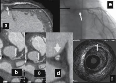 Figure 1.1 (A) Normal case: coronary angiography (left) and three‐dimensional CTA (right) showing normal left anterior descending (LAD, arrow) and left circumflex (LCX) coronary arteries. The latter is partially covered by the left appendix in CTA. (B) Normal case: coronary angiography (left) and CTA (right) showing a normal dominant right coronary artery (RCA). (C) An 85‐year‐old man with atypical chest pain: (a) Maximal intensity projection (MIP) of CTA with tight mid‐LAD stenosis that correlates perfectly with coronary angiography (b). (D) Similar case as (C) but with the stenosis in the proximal RCA. (a–d) CTA and (e) coronary angiography. (E) A patient with tight stenosis in the LCX before a bifurcation. (a) and (b) CTA and (c) coronary angiography. (F) These images show that CTA may also demonstrate the presence of stenosis in distal vessel branches, in this case in the posterior descending branch of the RCA. (a–b) CTA and (c) coronary angiography. (G) These images show that CTA (a, b) may delineate the length of a total occlusion and visualize the distal branches (see arrows in (b)). Collateral flow from the LAD to the RCA may be better visualized with CTA than with conventional coronary angiography (c: here only the RCA is shown). (H) A 42‐year‐old patient with a stent implanted in the LAD six months before. The patient complained of atypical chest pain and underwent CTA. The MIP images of CTA (a–c) show no significant restenosis, but some plaque formation in the left main trunk (d, circle) that was not well seen in coronary angiography (e). The degree of luminal obstruction by the plaque can be exactly measured by intravascular ultrasound (IVUS) (f). The ECG showed mildly inverted T waves in V1–V3 during follow‐up (see Plate 1 in color plates).