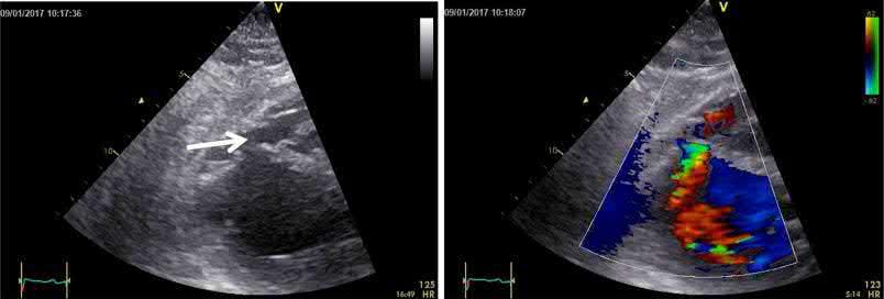 The persistence of ST elevations and hemodynamic instability should raise the suspicion of a post‐infarction mechanical complication. The echocardiogram should be repeated in several projections. Next figure shows a rupture of the interventricular septum (arrow) that had gone unnoticed. In this case the ECG pattern was an important key to raise the suspicion of an important complication of the disease.