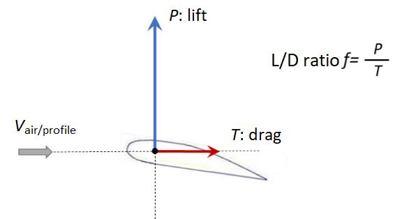 It is common to introduce the L/D ratio f, the aerodynamic characteristic and the dimensionless structural quality of the structure [FIL 12]. For a profile, this translates the ratio between the lift P and the forward resistance force (drag T) (Figure I.6). This concept can be applied to the aircraft model, that is: