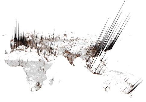 Based on a disaggregation of national GDP data for the year 2010, this visualisation uses the approach popularised by Richard Florida in his article ‘The World is Spiky’ (The Atlantic Monthly, October 2005, pp 48 – 51). Hinterlands – the world’s non-city spaces – are correspondingly represented as empty, barren and, by implication, economically marginal. Data source: UNEP – United Nations Environment Programme, 2012.