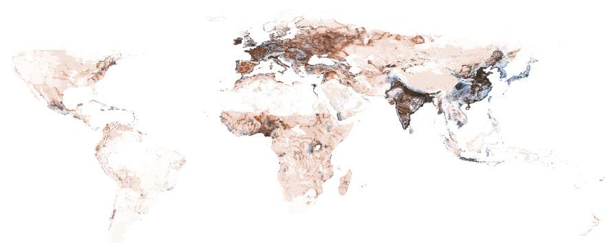 Neil Brenner and Nikos Katsikis, Map visualisation juxtaposing a demarcation of the world’s metropolitan agglomerations onto a rendering of the entire planet’s total ‘used area’ at the beginning of the 21st century