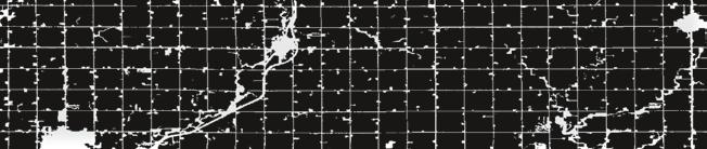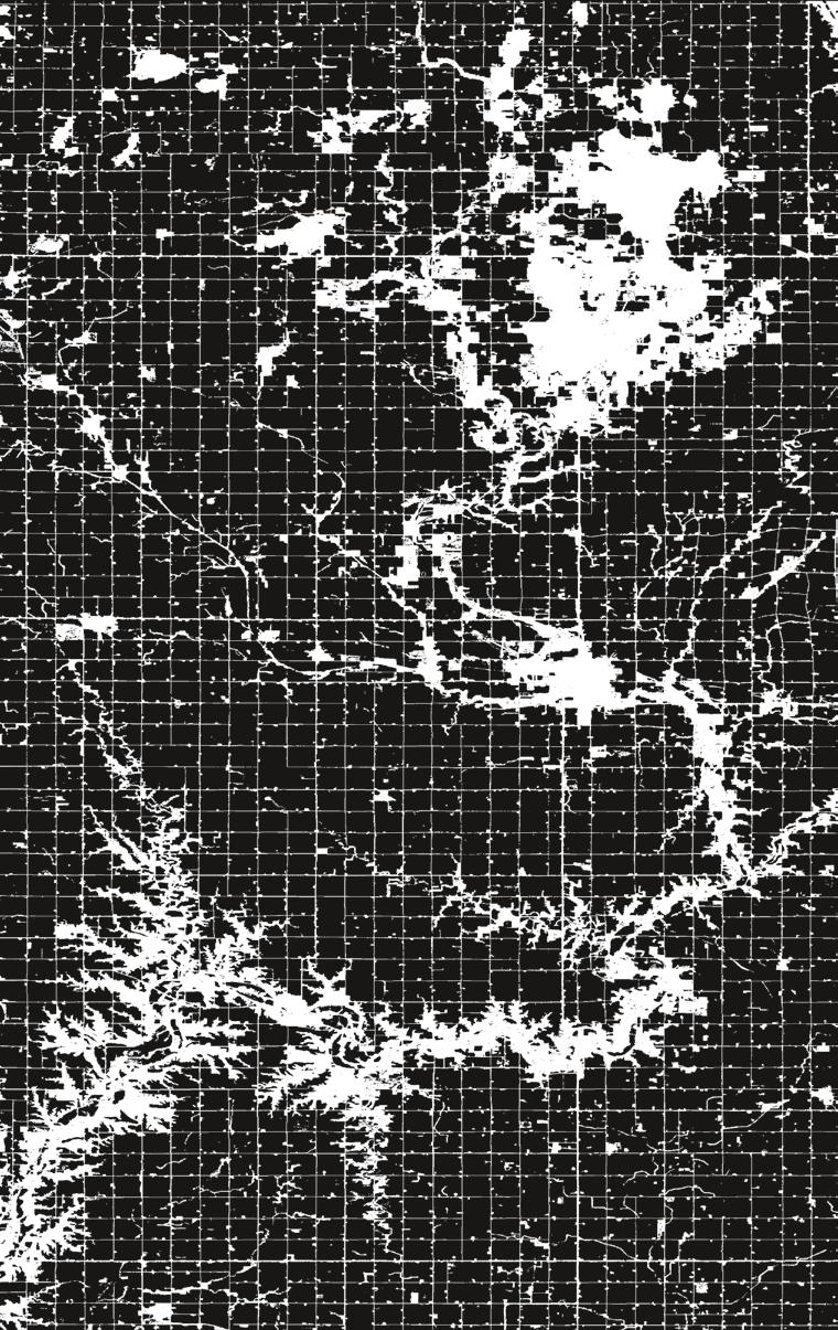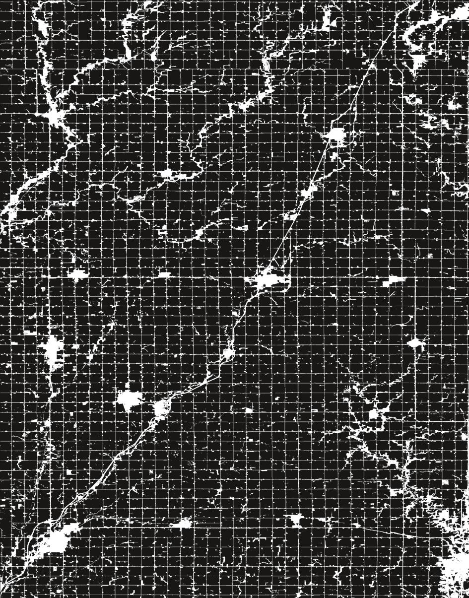Capital-intensive, highly industrialised and densely equipped landscapes of cash-crop monocultures dominate the Corn Belt, where more than 80 per cent of all land (depicted in black) is dedicated to the cultivation of corn and soya beans. The zone is configured among 1-mile (1.6-km) tiles within a Jeffersonian grid pattern. This permits the maximally efficient operation of agroindustrial machinery. Beneath this terrestrial surface is an extensive subterranean drainage system that supports soil tilling. Data source: USDA National Agricultural Statistics Service Cropland Data Layer (2018), published cropspecific data layer, available at https://nassgeodata.gmu.edu/ CropScape/.