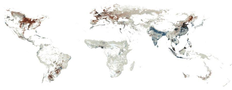 opposite top: The overlaying gradients on this composite map correspond to cropland areas dedicated to food production (blue) and to feed or non-food uses, such as energy and industrial inputs (red) as of the year 2000. Insofar as they supply specific industrial inputs to other hinterlands (for example, cattle feed to livestock production zones, or biofuel to the energy sector), the red zones represent hinterlands of hinterlands. Data source: E Cassidy, P West, J Gerber and J Foley, ‘Redefining Agricultural Yields: From Tonnes to People Nourished Per Hectare’, Environmental Research Letters, 8 (3), 2013, p 034015.