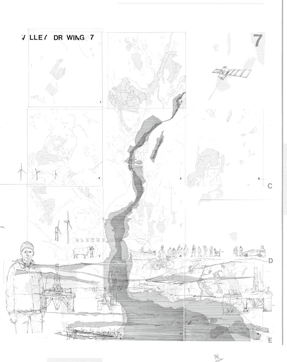 The complex of interactions across the valley are complicated by contemporary technologies, landscape processes and work practices. Drawing 7 represents these entangled relations, including historical accounts and future imaginaries, across a valley region in the north of Scotland.