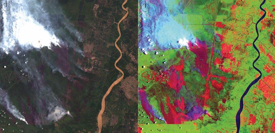 opposite: Working with satellite imagery and GIS software, MA student Yu experimented with colour band combinations (6, 5 and 2) to expose patterns of active burn and historical char in the detection of fire activity in peatlands.