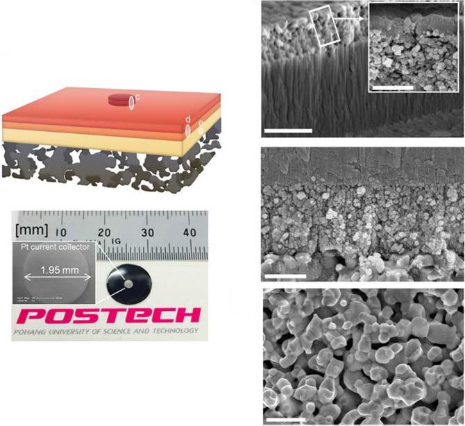 Figure1.5 Imageofmicro-SOFC.(a)SchematicofathinfilmMEAsupportedonporousSTS substrate.(b)Photographofacell.AlogoisatrademarkofPohangUniversityofScienceand Technology(POSTECH)andisprotectedbycopyright;itisusedinthisfigurewithpermission. Cross-sectionalSEMimageof(c)Pt/LSC/YSZ(Inset:magnifiedviewofPt/LSC),(d) YSZ/Ni-YSZ/LSTN-YSZ,and(e)LSTN-YSZcontactlayer.Source:Kimetal.2016[21].Reproduced withpermissionofSpringerNature.