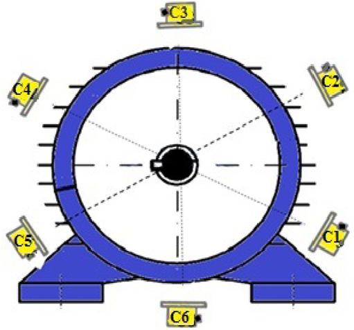As the detection performance depends on the position of the sensors regarding the localization of the fault in the winding, it is possible to improve the diagnosis using several sensor positions around the machine. The pair-forming sensors will be shifted by π as shown in Figure 1.11, where six sensors are used. However, it will not be possible to cover the entire periphery of the machine, for example, it is not possible to place a sensor under the base of the machine.