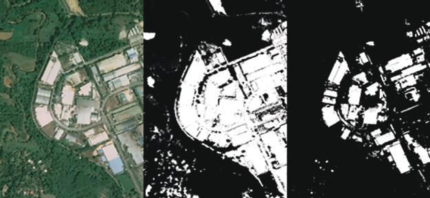 Figure 1.7 Original image (left). Image with building and roads (middle). Built-up areas (right).